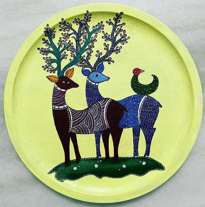 Immerse yourself in the world of Gond Art as you admire the intricate storytelling on this wooden plate.